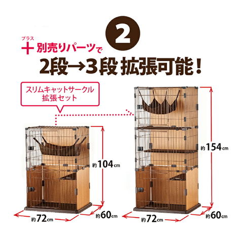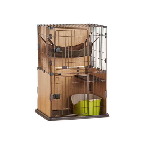 ボンビアルコン 猫ケージ ゲージ 2段タイプ 側面に壁あり 猫砂が飛び出さない 壁が汚れない スリムキャットサークル 木目 木目調 ハンモック付 猫用サークル スリム幅 省スペース【送料無料】