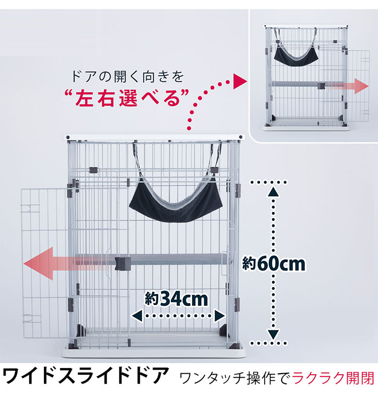 ・部屋のレイアウトに合わせて、左右反転できるためドアの開口向きを選べる。設置場所を選ばないフレキシブルなケージ。