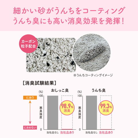 ネコちゃんがかきやすい細かい砂粒で、うんちを隠しやすい!さらに、砂がうんち全体をコーティングして防臭効果を高めます。