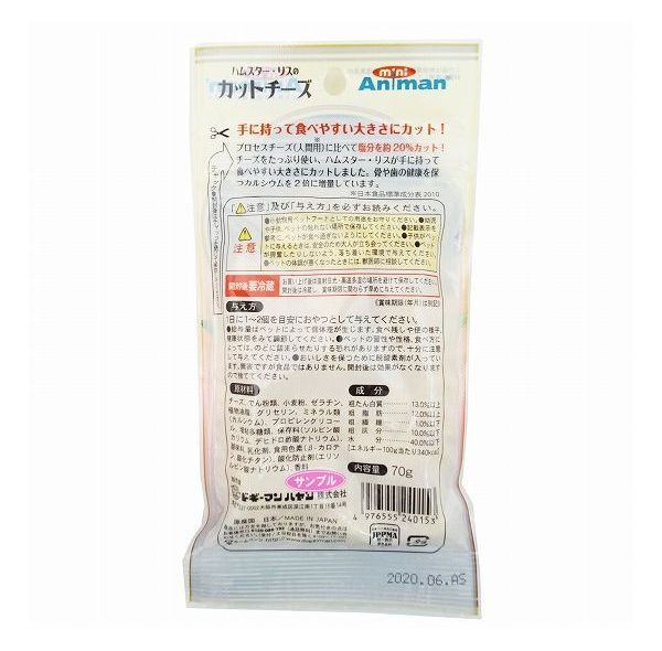 プロセスチーズ(人間用※)に比べて塩分を約20%カット!チーズをたっぷり使い、ハムスター・リスが手に持って食べやすい大きさにカットしました。歯や骨の健康を保つカルシウムを2倍に増量しています。
