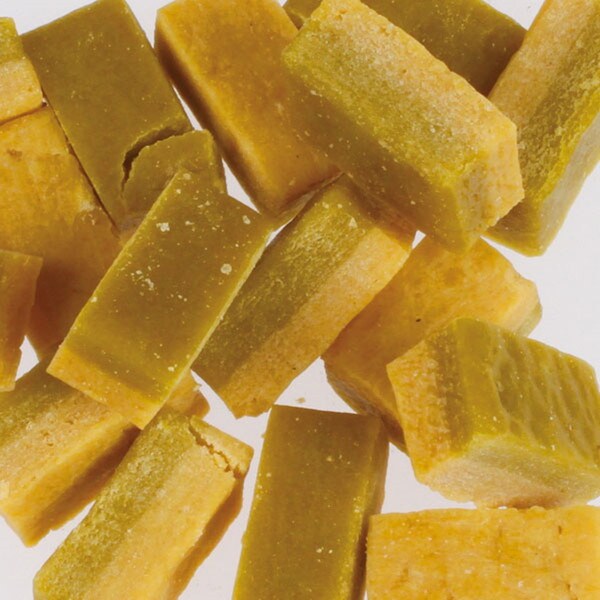 小麦粉、食物繊維、かぼちゃ、にんじん、ソルビトール、着色料(黄4、黄5、青1、酸化チタン)、ミネラル類(ナトリウム)、保存料(ソルビン酸カリウム)、pH調整剤、パパイン酵素、酸化防止剤(エリソルビン酸ナトリウム)、シャンピニオンエキス