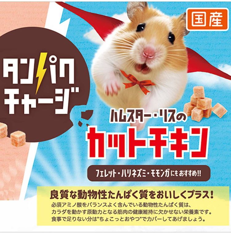 ・ハムスターやリス用おやつには穀物類の主食が多い中、日常の活動源にもなる動物性たんぱくを手軽に取り入れる事が出来るおやつです。