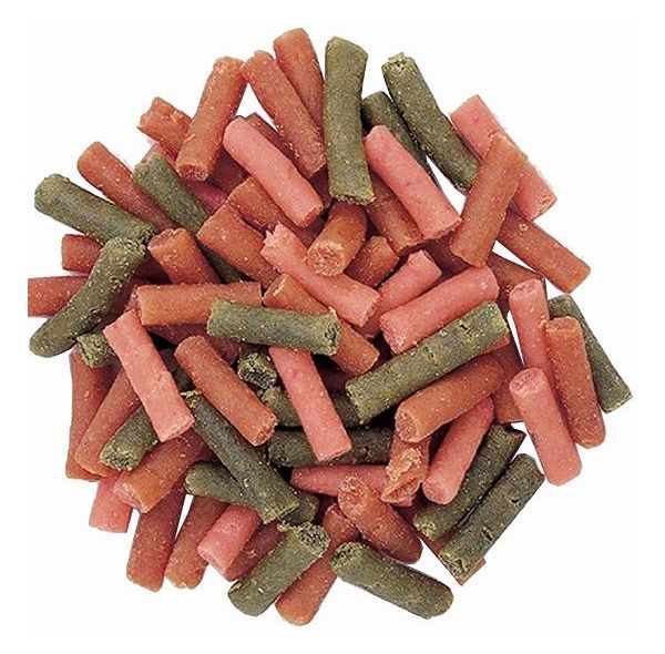 肉類(鶏肉、鶏ササミ)、小麦粉、大豆加工品、パン粉、植物油脂、糖類、脱脂大豆、ビール酵母、にんじん、ほうれん草、ソルビトール、ミネラル類(カルシウム、ナトリウム、亜鉛、鉄、銅、ヨウ素)、プロピレングリコール、保存料(ソルビン酸、デヒドロ酢酸ナトリウム)、ビタミン類(A、B1、B2、B6、B12、C、D3、E、ナイアシン、パントテン酸)、ポリリン酸ナトリウム、くん液、膨張剤、発色剤(亜硝酸ナトリウム)、着色料(二酸化チタン、赤106、黄4、青1)、pH調整剤