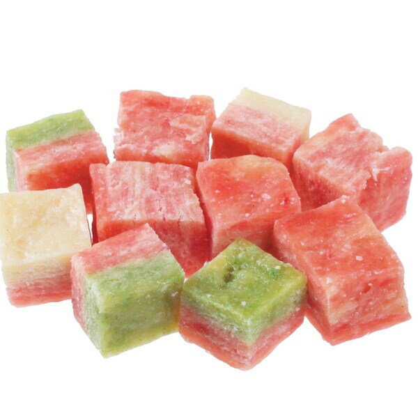 小麦粉、肉類(鶏ササミ、鶏肉、牛肉)、チーズ、でん粉類、ほうれん草、ソルビトール、グリセリン、膨張剤、着色料(赤106、黄4、黄5、青1、酸化チタン)、保存料(ソルビン酸カリウム)、酸味料、ミネラル類(ナトリウム)、酸化防止剤(エリソルビン酸ナトリウム)、香料