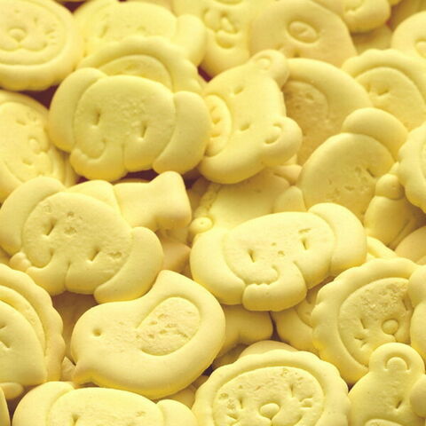 小麦粉、砂糖、植物油脂、タピオカでん粉、ミルクパウダー、チーズ、チコリ抽出物(食物繊維、オリゴ糖含有)、ユッカエキス、ミネラル類(カルシウム、ナトリウム)、膨張剤、香料、着色料(黄4)、酸化防止剤(ビタミンE)