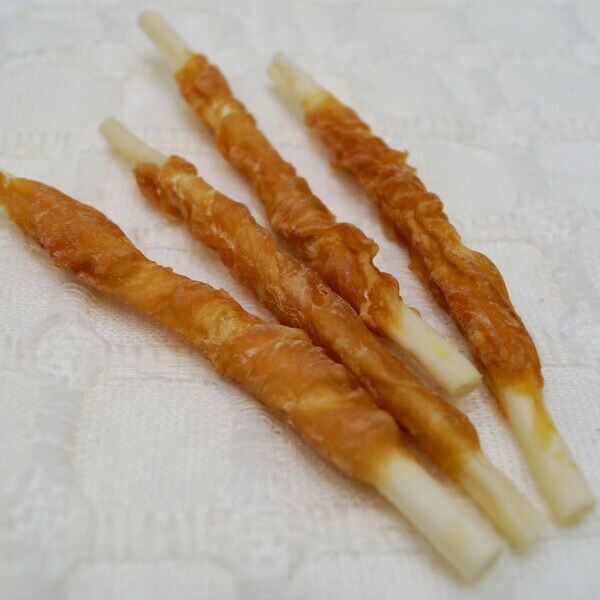 噛むことで歯垢を除去する牛皮ガムにササミを巻いた絶品おやつです。