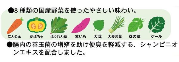 馬鈴薯でん粉、水飴、砂糖、小麦粉、卵、オリゴ糖、液糖、脱脂粉乳、野菜類(大麦若葉、ケール、ほうれん草、かぼちゃ、にんじん、桑の葉、大葉)、シャンピニオンエキス、紫いも、ミネラル類(カルシウム)、膨張剤