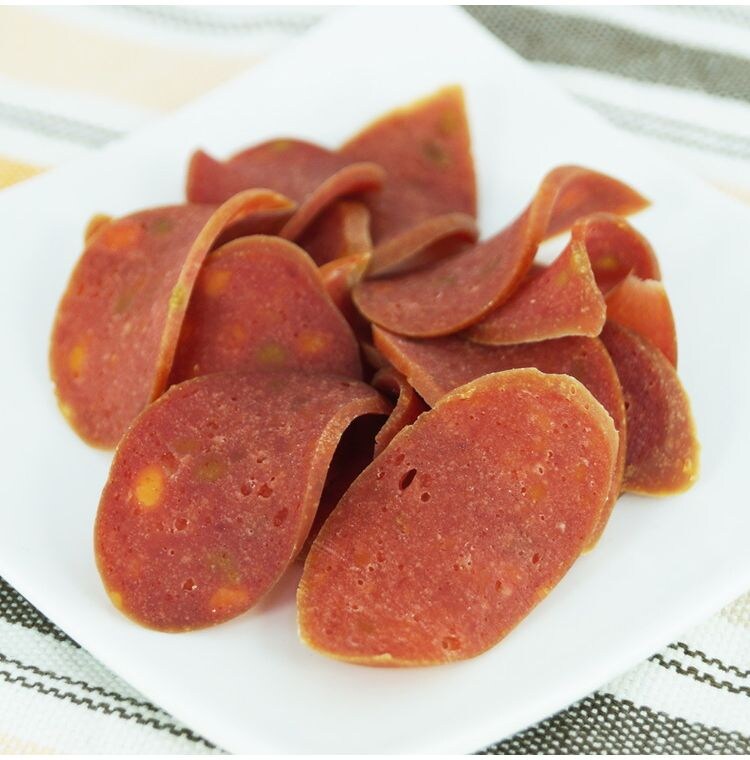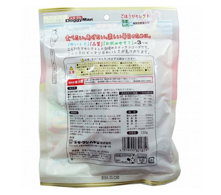 鶏肉(レバー、ササミ)、小麦粉、コーンスターチ、にんじん、かぼちゃ、ほうれん草、ソルビトール、グリセリン、リン酸塩(Na)、保存料(ソルビン酸カリウム)、発色剤(亜硝酸ナトリウム)、着色料(β―カロテン、カラメル、赤106、青1)