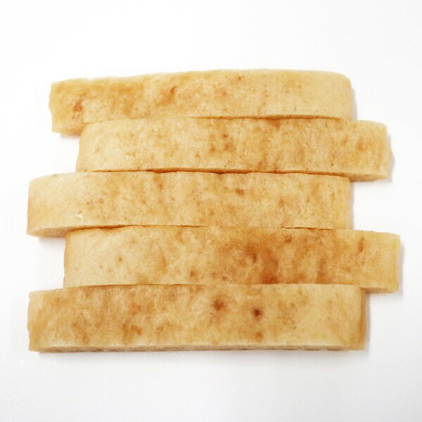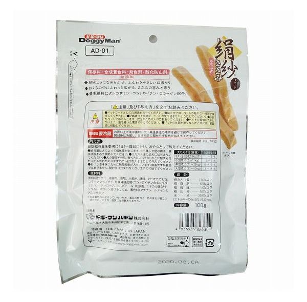 肉類(鶏ササミ、鶏胸肉、鶏肉)、小麦粉、糖類、タピオカでん粉、コラーゲンペプチド、魚軟骨抽出物(コンドロイチン含有)、グリセリン、トレハロース、ソルビトール、膨張剤、ミネラル類(ナトリウム)、ポリリン酸ナトリウム、着色料(クチナシ、ルテイン)、グルコサミン