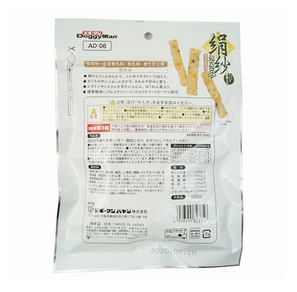 肉類(鶏ササミ、鶏胸肉、鶏肉)、小麦粉、糖類、タピオカでん粉、植物油脂、野菜類(ほうれん草、にんじん)、コラーゲンペプチド、魚軟骨抽出物(コンドロイチン含有)、グリセリン、トレハロース、膨張剤、ソルビトール、ミネラル類(ナトリウム)、ポリリン酸ナトリウム、着色料(クチナシ、ルテイン、クロレラ)、グルコサミン