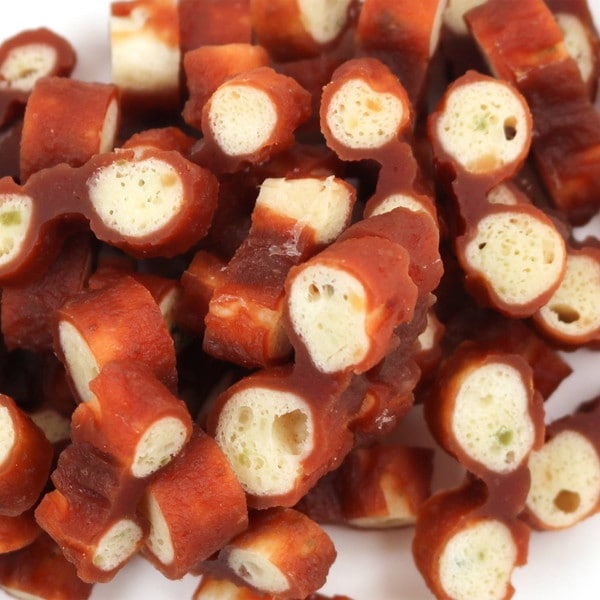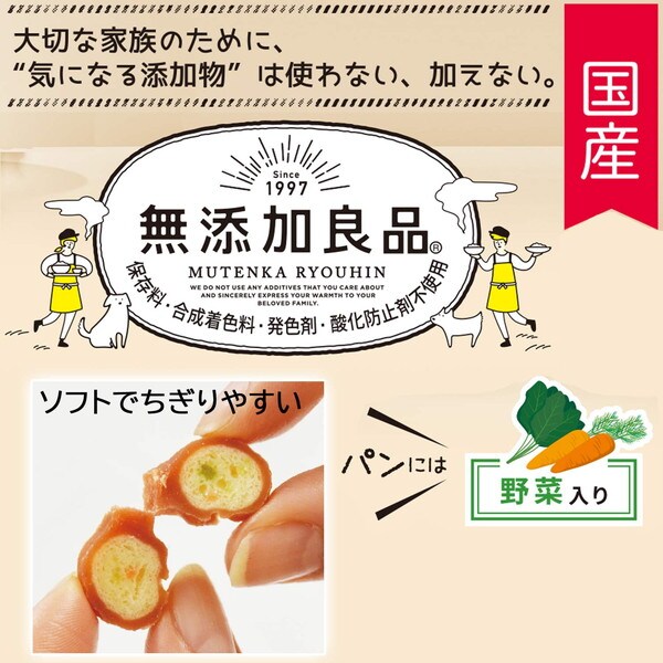 肉類(鶏肉、ササミ、レバー、牛皮)、小麦粉、でん粉類、にんじん、ほうれん草、クロレラ、軟骨抽出物(コンドロイチン含有)、グリセリン、ソルビトール、ミネラル類(カルシウム)、膨張剤、リン酸塩(Na)、着色料(紅麹)、グルコサミン