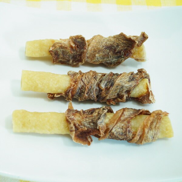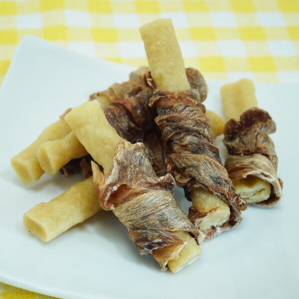保存料、着色料、発色剤、酸化防止剤を使わずに作りました。魚と鶏の軟骨が入った噛みごたえあるスティックに、濃厚なおいしさの赤いもも肉を巻きつけました。軟骨形成成分が、関節の健康を維持します。