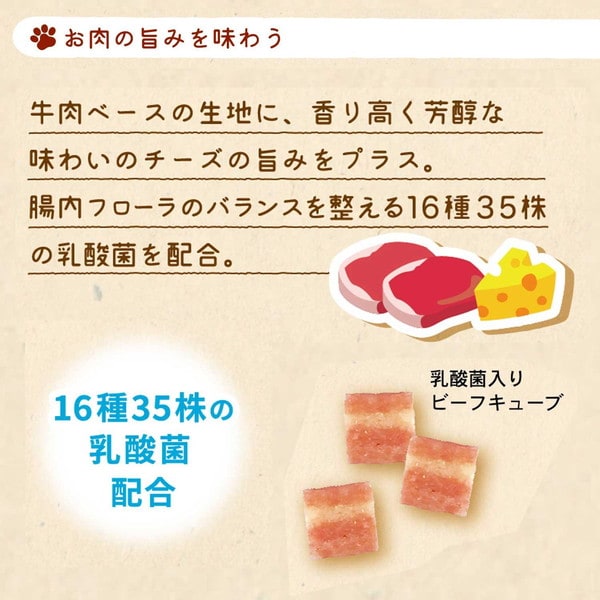 保存料、合成着色料、発色剤、酸化防止剤を使わずに作りました。お肉のおいしさがギュッと詰まった牛肉ベースの生地に、芳醇な味わいのチーズの旨みをプラスしました。腸内フローラのバランスを整える16種35株の乳酸菌配合。