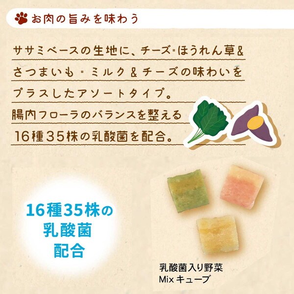 ササミベースの生地に、チーズや野菜、3種の味のアソートタイプ