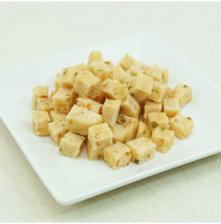 肉類(鶏ササミ、鶏胸肉、鶏肉)、小麦粉、糖類、タピオカでん粉、植物油脂、野菜類(ほうれん草、にんじん)、コラーゲンペプチド、魚軟骨抽出物(コンドロイチン含有)、グリセリン、トレハロース、ソルビトール、膨張剤、ミネラル類(ナトリウム)、ポリリン酸ナトリウム、着色料(クチナシ、マリーゴールド、クロレラ)、グルコサミン