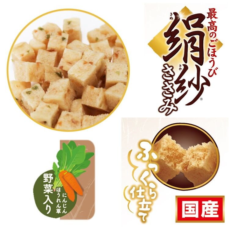 大人気の絹紗に大容量ボリュームパックが新登場。フレッシュな味わいや香りが長持ちする、便利な100g×3袋の分包タイプ。ササミたっぷり、至福の味わい。ふんわりやわらか新食感のごほうびおやつ。絹のようなおいしさをワンちゃんにお届けします。ビタミン、ミネラルを含むにんじん、ほうれん草入り。保存料、合成着色料、発色剤、酸化防止剤不使用。