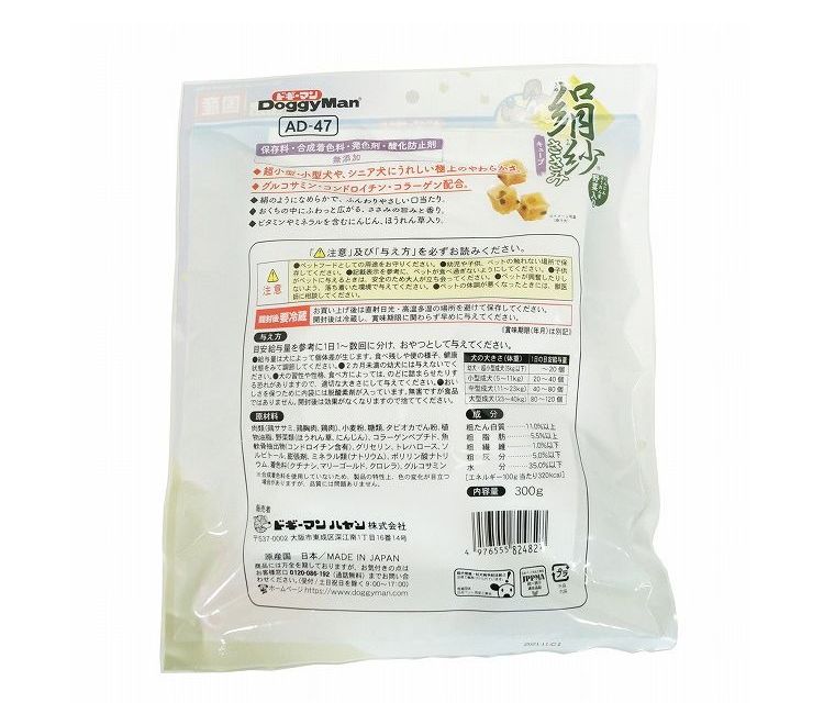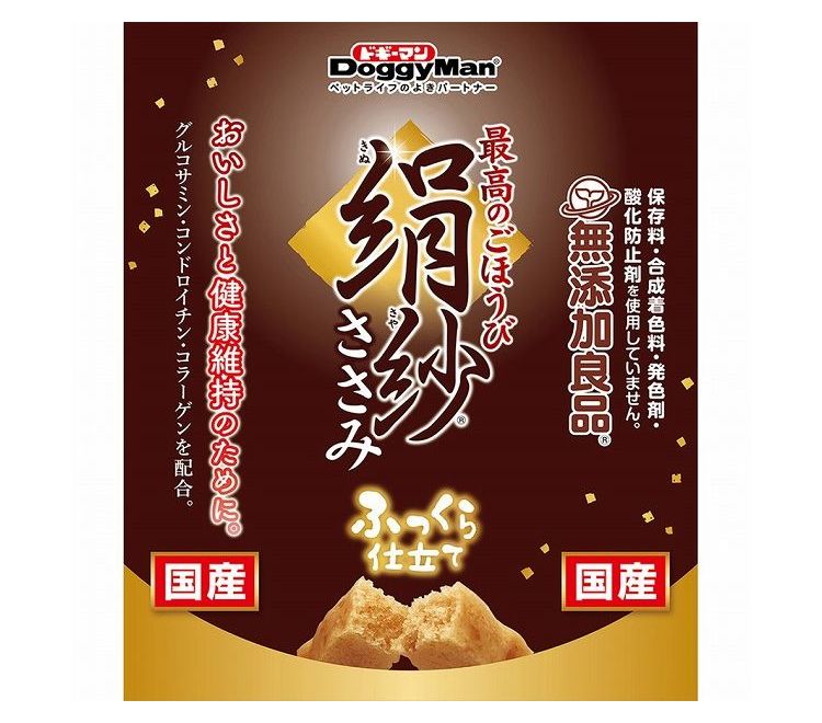 大人気の絹紗に大容量ボリュームパックが新登場。フレッシュな味わいや香りが長持ちする、便利な100g×3袋の分包タイプ。ササミたっぷり、至福の味わい。ふんわりやわらか新食感のごほうびおやつ。絹のようなおいしさをワンちゃんにお届けします。ビタミン、ミネラルを含むにんじん、ほうれん草入り。保存料、合成着色料、発色剤、酸化防止剤不使用。