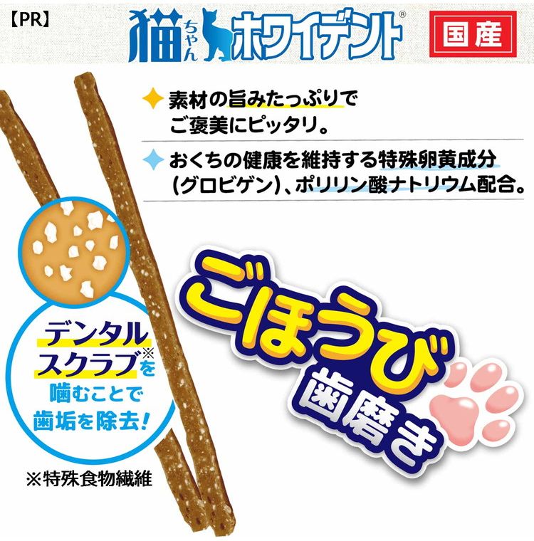 猫ちゃんのおいしいデンタルケアスナック。デンタルスクラブを噛むことで歯垢を除去!おくちの健康を維持する特殊卵黄成分(グロビゲン)、ポリリン酸ナトリウム配合。旨みたっぷりなマグロ入り。