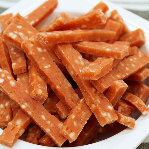 肉類(鶏肉、鶏ササミ)、小麦粉、糖類、でん粉類(コーンスターチ、小麦でん粉)、豆類、チーズ、ビフィズス菌、ソルビトール、グリセリン、ミネラル類(ナトリウム)、酸味料、リン酸塩(Na)、保存料(ソルビン酸カリウム)、酸化防止剤(ビタミンC)、発色剤(亜硝酸ナトリウム)、セルロース、着色料(黄4、赤106)、調味料