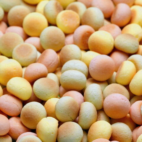 馬鈴薯でん粉、砂糖、卵、小麦粉、はちみつ、ブドウ糖、粉乳、野菜(かぼちゃ、にんじん、ほうれん草)、着色料(ウコン、テーブルビート、クチナシ)、膨張剤