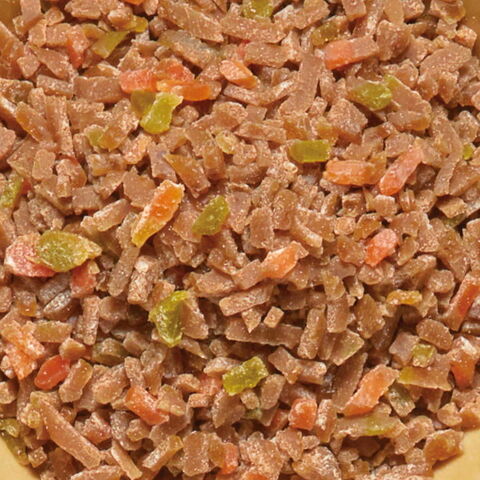 小麦粉、コーンスターチ、肉類(鶏肉、鶏レバー)、にんじん、ほうれん草、ソルビトール、グリセリン、着色料(カラメル、β-カロテン、赤106、青1)、香料