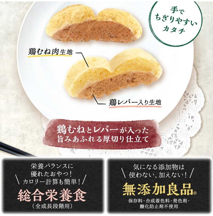 肉類(鶏ササミ、鶏胸肉、鶏肉、鶏レバー)、小麦粉、糖類、タピオカでん粉、ビール酵母、魚介エキス、魚介パウダー、油脂類、グリセリン、ミネラル類(カルシウム、ナトリウム、カリウム、亜鉛、鉄、セレン、銅、ヨウ素)、トレハロース、膨張剤、ソルビトール、ポリリン酸ナトリウム、着色料(クチナシ、カラメル)、ビタミン類(E、B12、B2、D)