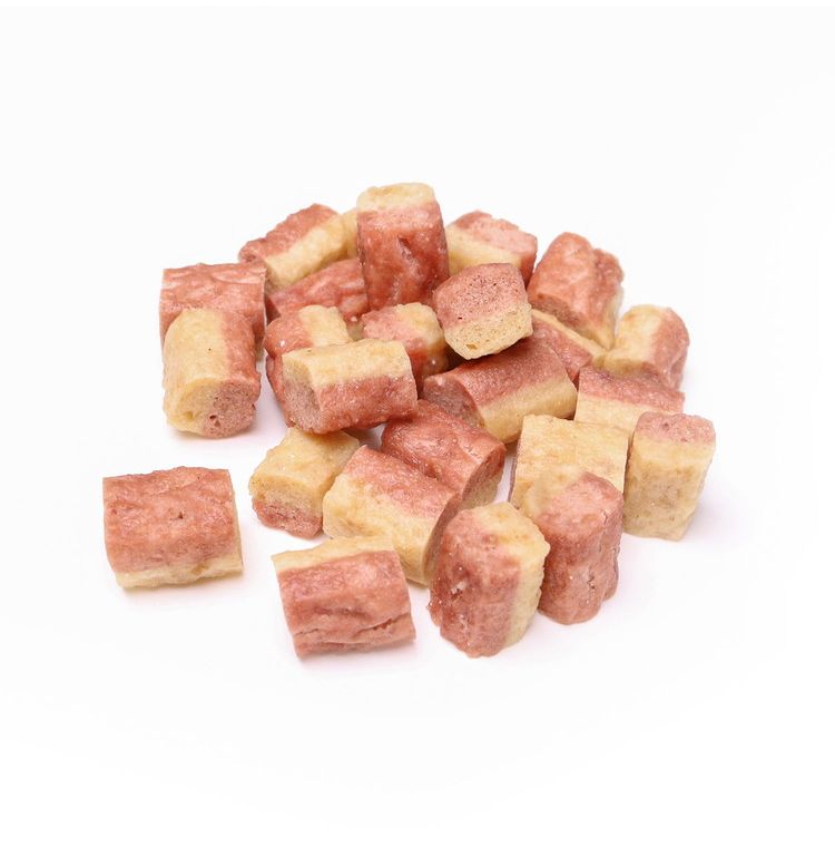 肉類(鶏ササミ、鶏胸肉、鶏肉、鶏レバー)、小麦粉、糖類、タピオカでん粉、ビール酵母、魚介エキス、魚介パウダー、油脂類、グリセリン、ミネラル類(カルシウム、ナトリウム、カリウム、亜鉛、鉄、セレン、銅、ヨウ素)、トレハロース、膨張剤、ソルビトール、ポリリン酸ナトリウム、着色料(クチナシ、カラメル)、ビタミン類(E、B12、B2、D)
