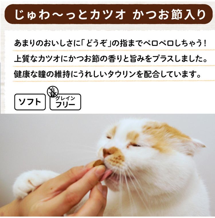 魚介類(かつお、かつお節、魚介エキス)、肉類(鶏ササミ、牛コラーゲン)、えんどう豆たん白、糖類、たん白加水分解物、酵母エキス、デキストリン、増粘安定剤(加工でん粉)、ソルビトール、ミネラル類(ナトリウム)、ポリリン酸ナトリウム、pH調整剤、くん液、タウリン