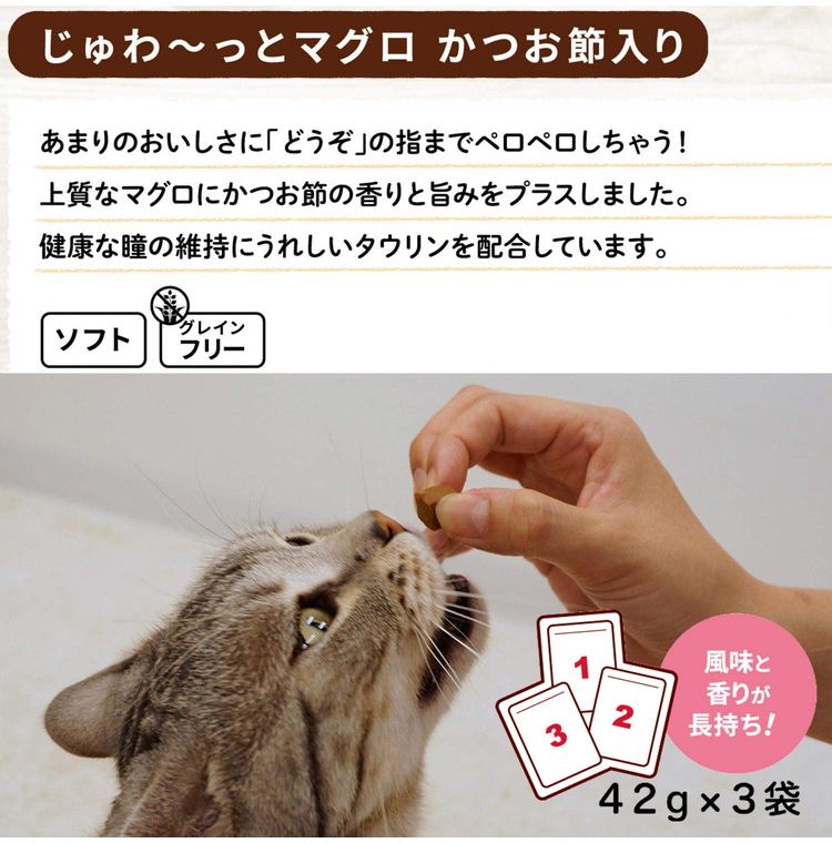 ・上質なまぐろにかつお節の香りと旨味をプラスした猫用スナックです。