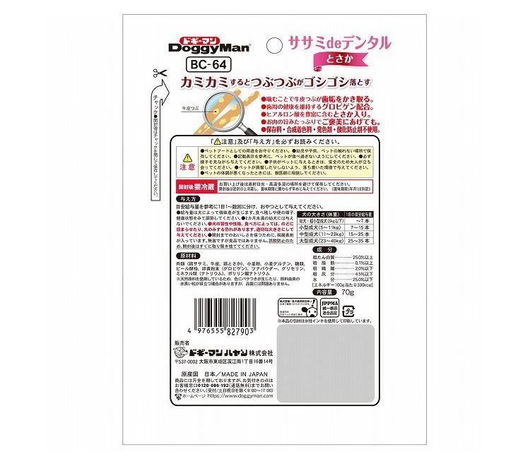 肉類(鶏ササミ、牛皮、鶏とさか)、小麦粉、小麦グルテン、糖類、ビール酵母、卵黄粉末(グロビゲン)、ツナパウダー、グリセリン、ミネラル類(ナトリウム)、ポリリン酸ナトリウム