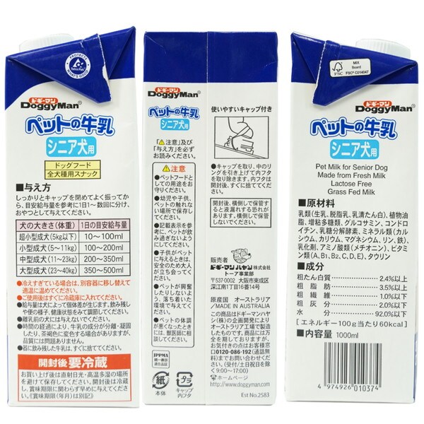・オーストラリア産の生乳から作った、生乳そのままの風味が生きているシニア犬用の牛乳です。