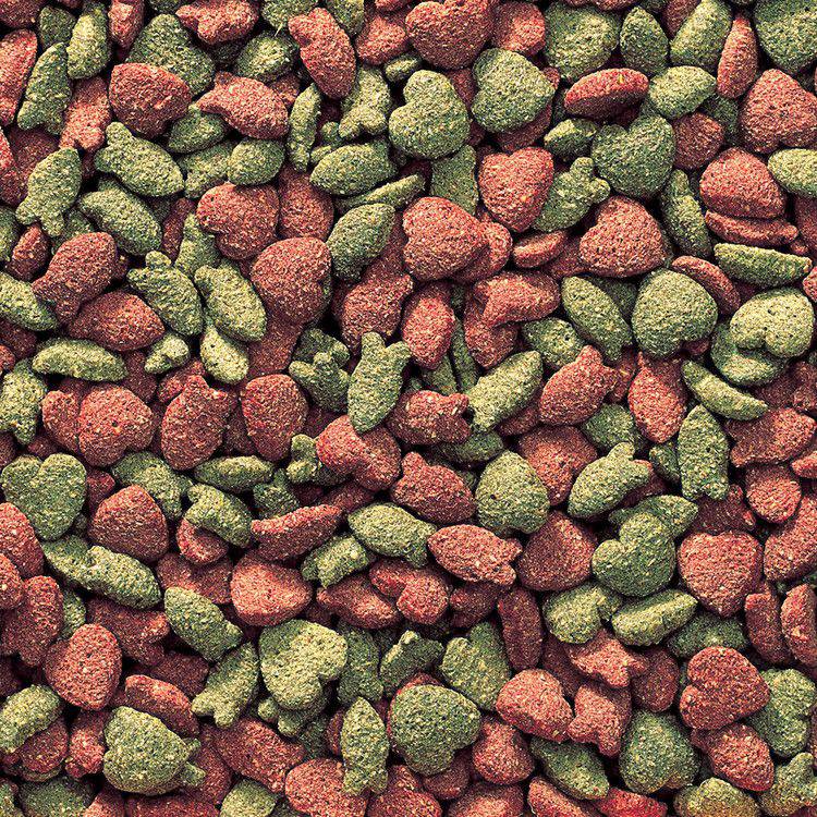トウモロコシ、小麦粉、脱脂大豆粕、アルファルファミール、小麦ふすま、チキンミール、魚粉、動物性油脂、植物性油脂、穀物発酵エキス、ミネラル類(炭酸カルシウム、塩化ナトリウム、第二リン酸カルシウム、硫酸亜鉛、硫化銅、ヨウ素酸カルシウム)、ビタミン類(A、B1、B2、B3、B6、B12、D3、E、K、D-パントテン酸カルシウム、葉酸)、甘味料(ステビア抽出物)、着色料(黄4、黄5、赤106、赤2、青1)