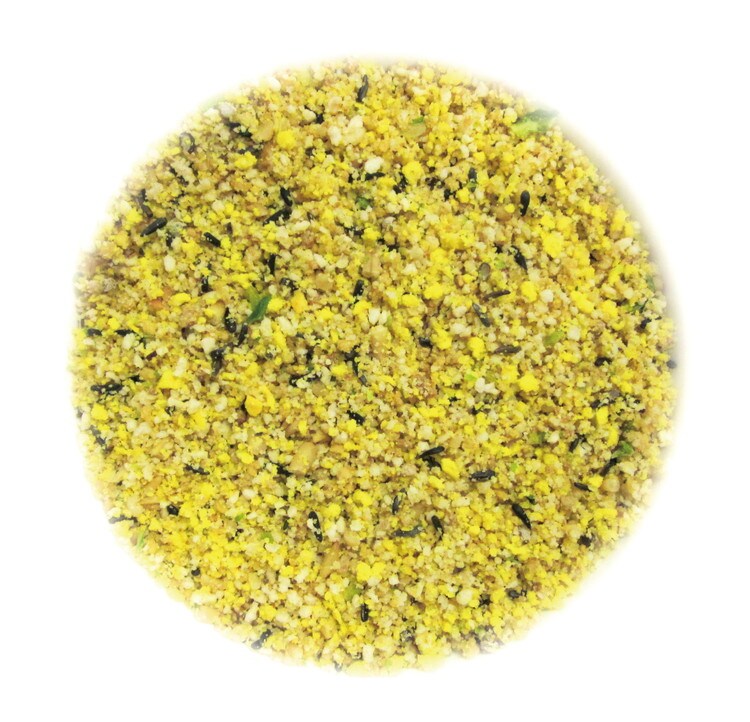 卵加工品(小麦粉、卵、イースト、塩化ナトリウム)、ブドウ糖、ムキえん麦、ココナッツパウダー、ニガーシード、乾燥キャベツ、ピーナッツオイル、麻の実、ゴマの実、増粘安定剤(グリセリン、ソルビトール)、ビタミン類(B1、B2、B6、B12、C、D3、E、ナイアシン、パンテトン酸、ビオチン、塩化コリン、葉酸)、ミネラル類(Fe、Mn、Cu、Zn、Co)