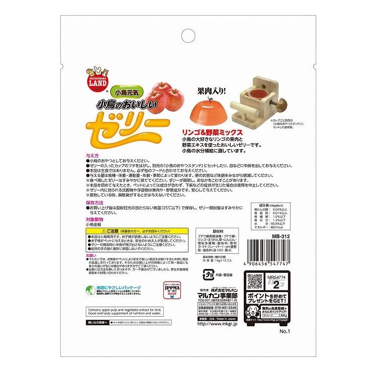 小鳥の大好きな酸味のあるリンゴの果肉と野菜エキスを使ったおいしいゼリーです。小鳥の水分補給に適しています。