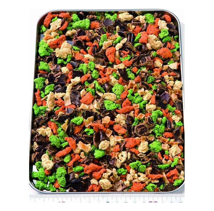トウモロコシやニンジン、じゃがいも、優しい甘みのイナゴ豆などカリカリに仕上げて、栄養バランスよくミックスしました。