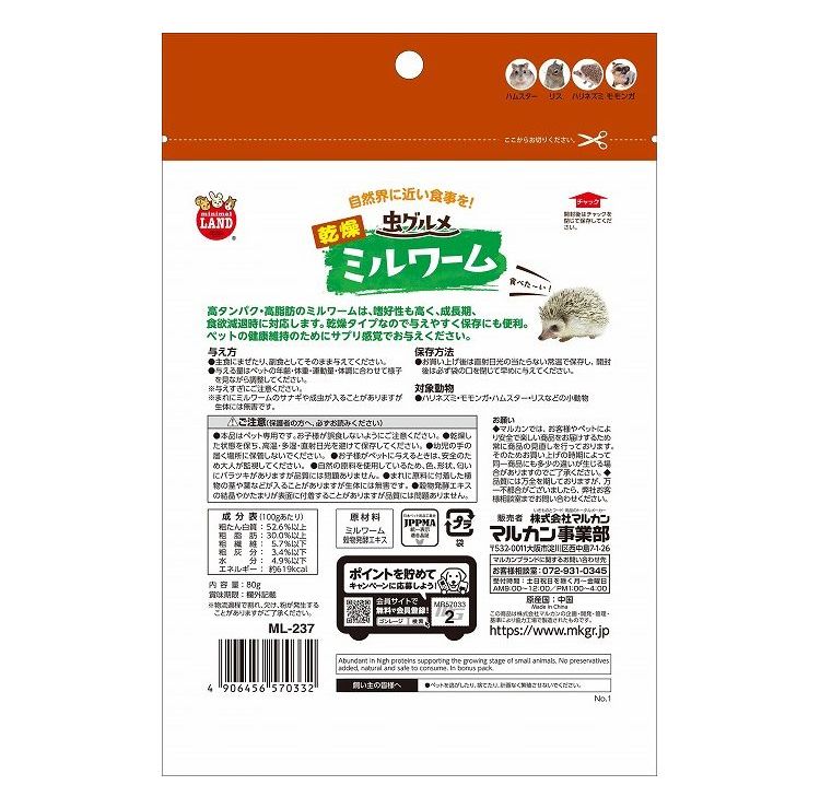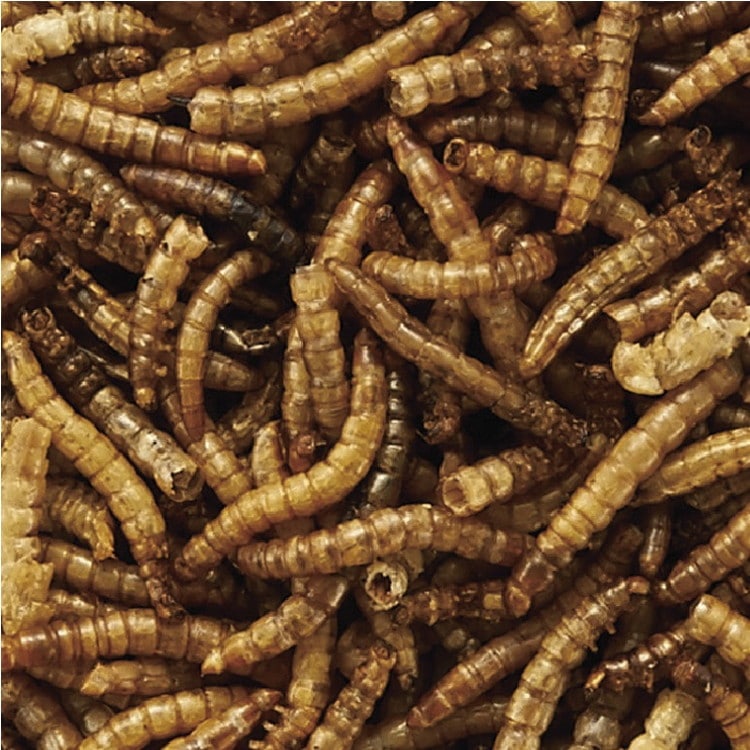 与えやすく、保存しやすい乾燥タイプのミルワーム。高タンパク、高脂肪でエネルギー補給にぴったり。便臭緩和成分配合。