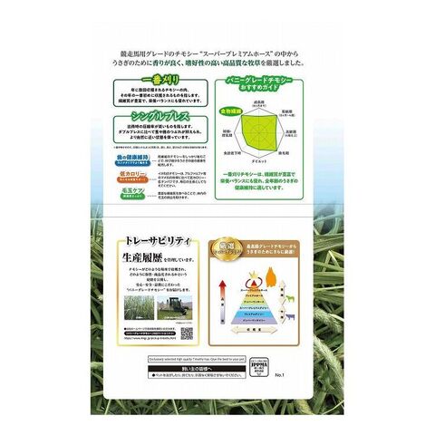 競走馬用グレードのチモシー”スーパープレミアムホース”の中からうさぎのために香りが良く、嗜好性の高い高品質な牧草を厳選しました。