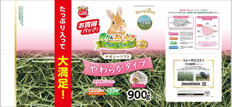 硬い牧草が苦手な仔うさぎや、噛む力が弱くなったシニアに適しています。やわらかく食べやすいので、普段の牧草に飽きてしまった子にもおすすめです。