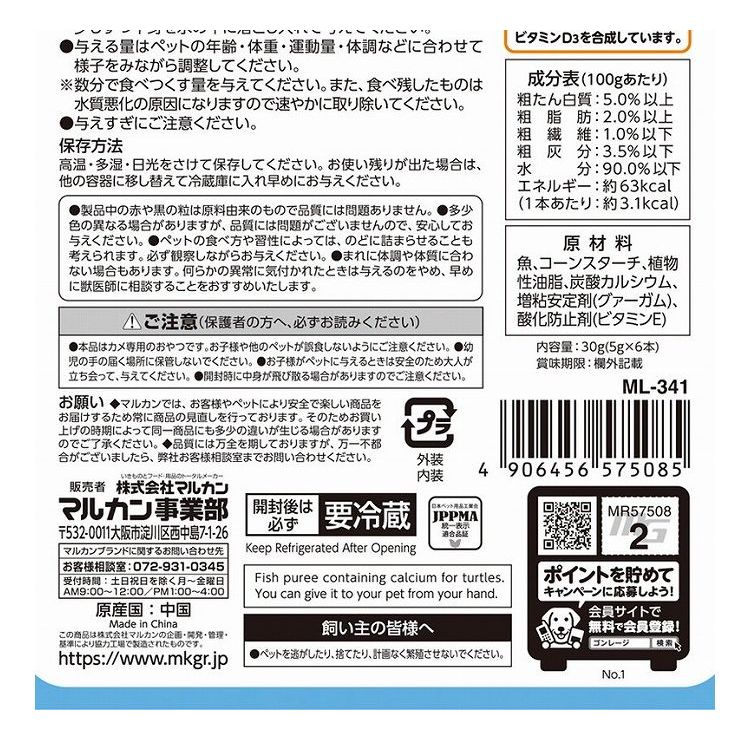 手から直接与えてコミュニケーションが取れる、ピューレタイプの水棲カメ用おやつです。たんぱく質たっぷりのさかなを主原料に、カルシウムを配合。カメの健康な成長を助けます。