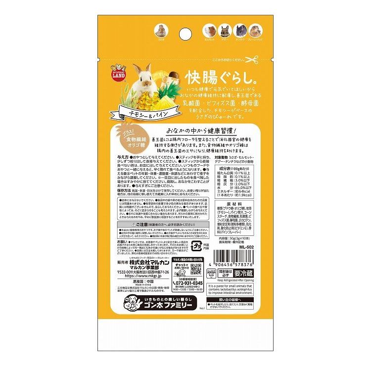 糖類(ブドウ糖・オリゴ糖)、牧草(チモシー)、パイン果汁、コーンスターチ、食物繊維、乳酸菌、ビフィズス菌、酵母菌、βカロテン、増粘安定剤(増粘多糖類)、乳化剤、酸化防止剤(ビタミンE)、香料(パインフレーバー)