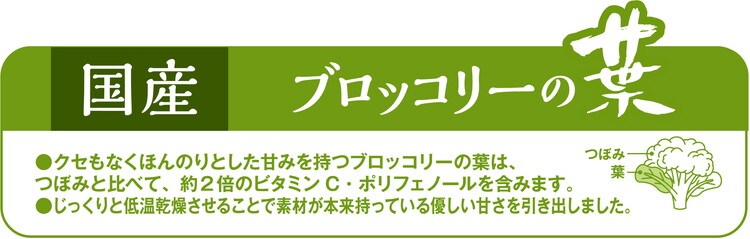 天然素材をそのままシンプルに乾燥させた、着色料・保存料不使用の安心してうさぎ・小動物おやつです。くせもなくほんのりとした甘みを持つブロッコリーの葉は、つぼみと比べ、約2倍のビタミンCやポリフェノールを含みます。じっくりと乾燥させることで素材が本来持っている優しい甘みを引き出しました。