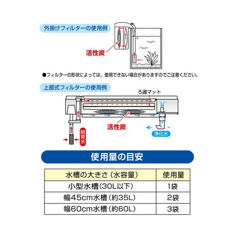・魚病薬などの薬品類をご使用の際は、活性炭が薬品類の有効成分を吸着し、効果がなくなりますのでご注意下さい。