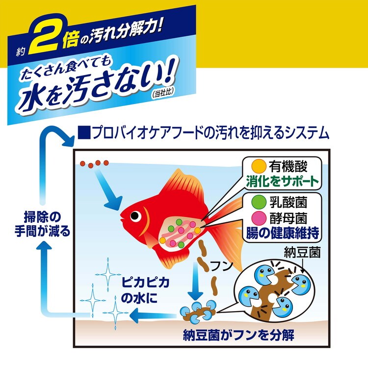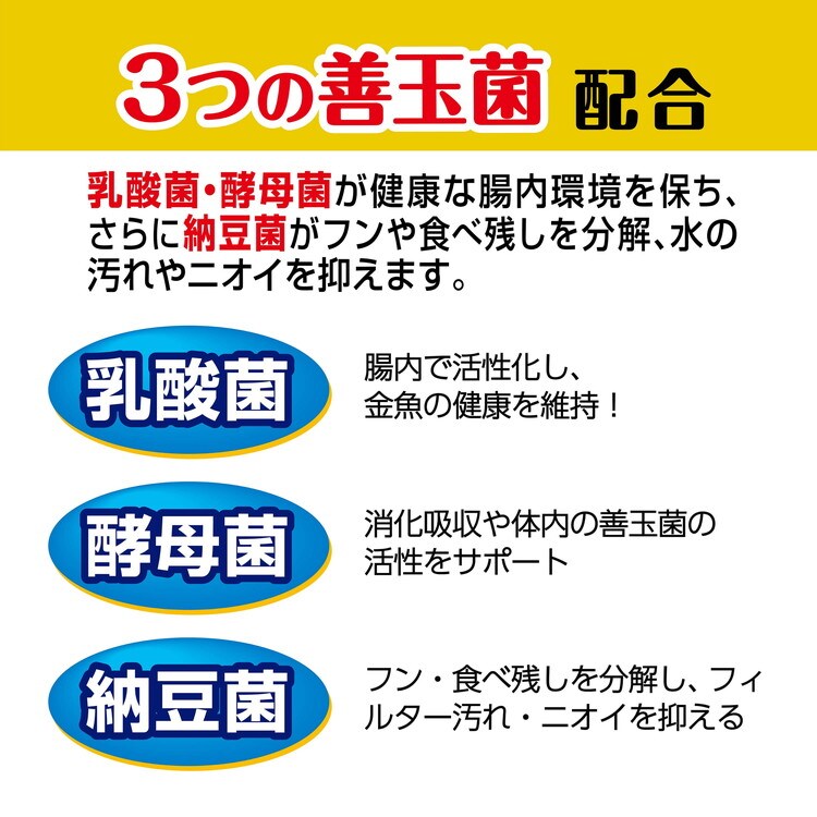 ・乳酸菌、酵母菌が健康な腸内環境を保ち、さらに納豆菌がフンや食べ残しを分解、水の汚れやニオイを抑えます。