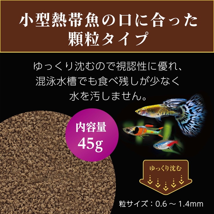 ・小型熱帯魚の口に合った顆粒タイプ。ゆっくり沈むので視認性に優れ、混泳水槽でも食べ残しが少なく水を汚しません。