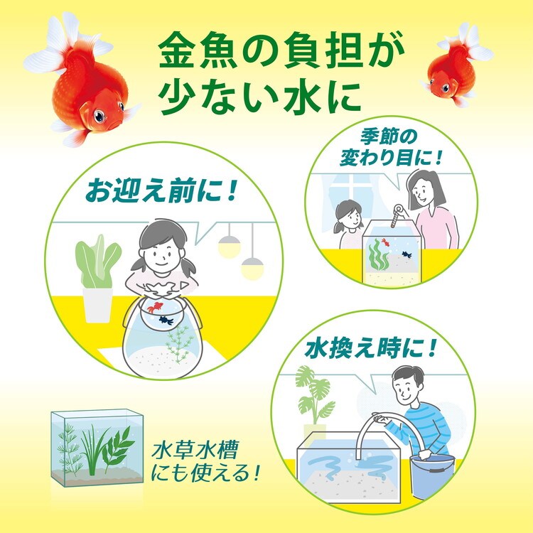 ・金魚のお迎え時や季節の変わり目、水換えの時などに。金魚の負担が少ない水です。