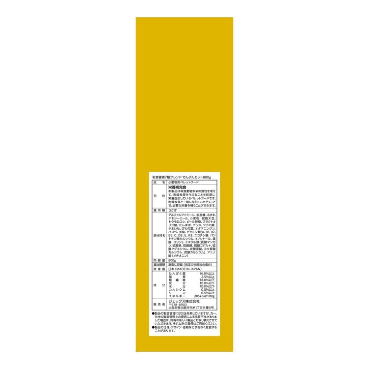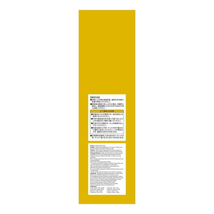 アルファルファミール、脱脂糠、ふすま、チモシーミール、小麦粉、脱脂大豆、トウモロコシ、ビール酵母、フラクトオリゴ糖、たんぽぽ、ナツメ、クコの葉、やまいも、びわの葉、オタネニンジン、ハコベ、並塩、ビタミン類(A、B1、B2、B6、C、D3、E、K3、ニコチン酸、パントテン酸カルシウム、イノシトール、葉酸、コリン)、ミネラル類(硫酸マンガン、硫酸鉄、硫酸銅、硫酸コバルト、硫酸マグネシウム、炭酸亜鉛、ヨウ素酸カルシウム、炭酸カルシウム)、アミノ酸(メチオニン)
