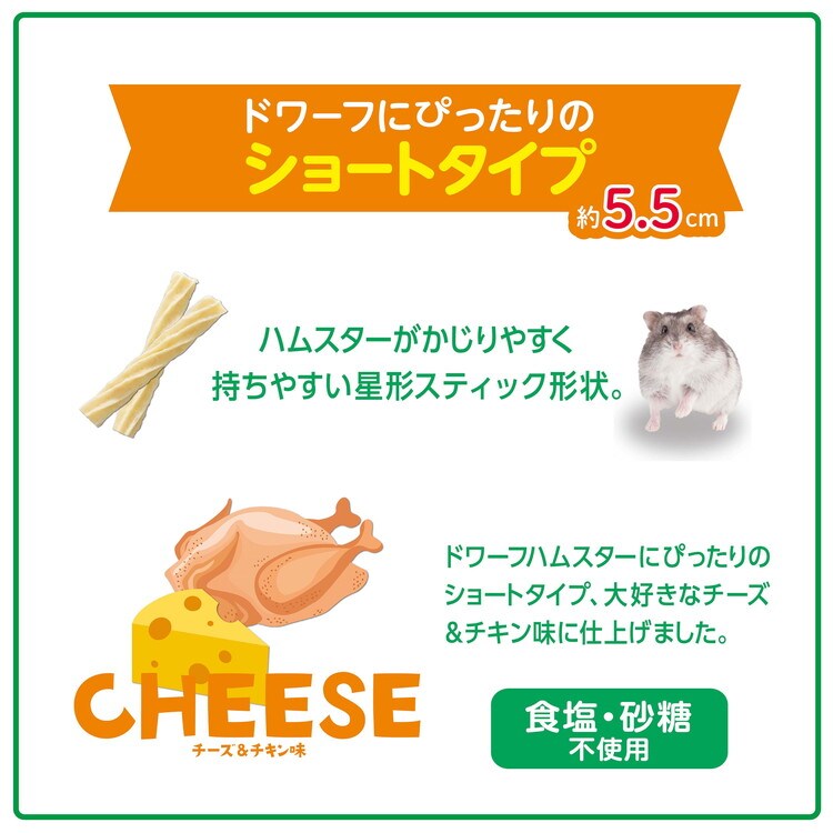 ・ドワーフハムスターにぴったりのショートタイプ。大好きなチーズ&チキン味に仕上げました。