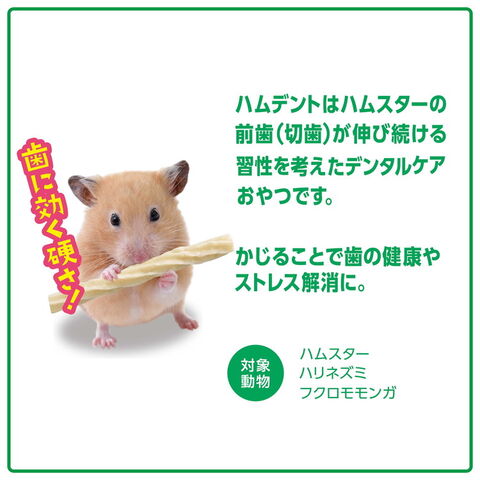 ・ハムデントはハムスターの前歯(切歯)が伸び続ける習性を考えたデンタルケアおやつです。かじることで歯の健康やストレス解消に。