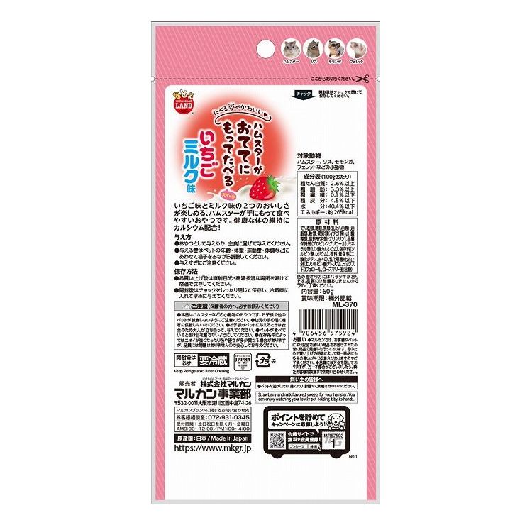 1粒でいちごとミルクの2つの味が楽しめるキューブ状のハムスターが手に持って食べやすいおやつです。カルシウム配合。