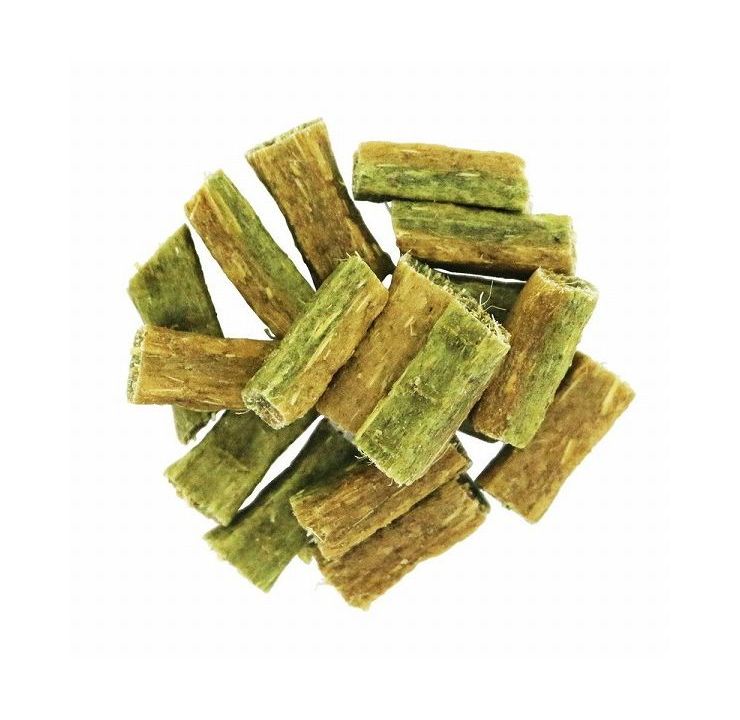 2種類の牧草(チモシー&クレイングラス)を組み合わせ、適度な噛みごたえあるおやつに仕上げました。